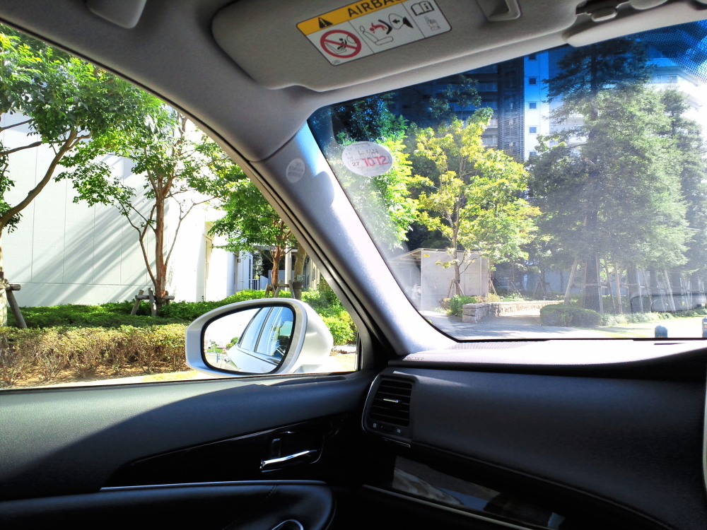 Aピラー方向の視界。Aピラーは昨今のトヨタの政策により目立たない細さ、角度形状をもつ。若干フロントガラスに写し込むがこれは許容範囲。フロントガラスもやや立ち気味で圧迫感もあまりない。ドアミラーの位置はもう少し前方にあったほうがよく、さらにダイエットし、もっというなら鏡面は綺麗に四角型をしていたほうがより視界を確保しうる。
