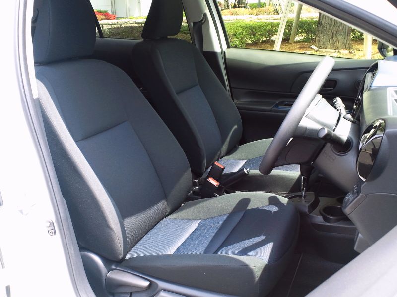 このグレードはチルト&テレスコピック調整可能なステアリング。メーターはややセンター寄りの配置で、燃費や走行状態のモニターなども各座席から見えるように、敢えてそうしてあるのだろう。ナビはディーラーオプションのみでDINサイズに収まる。エアコンの操作系もプッシュボタンとダイアルを組み合わせてシンプルに。シフトレバーはプリウス式にあらず、ふつうのゲート式。パワーウインドウは運転席のみワンタッチ。運転席シートにはラチェット式リフター。駐車ブレーキは一般的なレバー式。