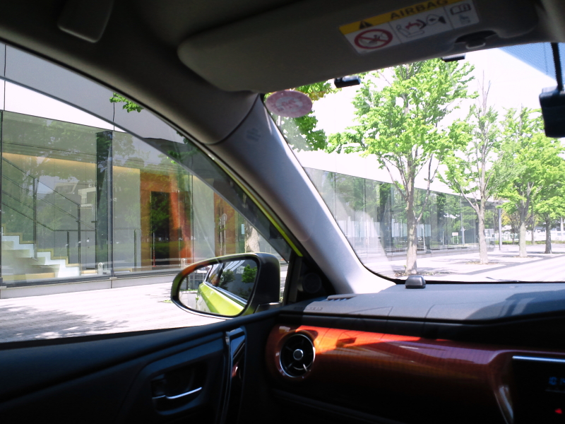 Aピラーは白くて下側が余計に写り込んでいる。せめて黒く塗ってください。ダッシュボードはあまり写り込まない。サイドミラーはせっかく大きいのに外側上端が斜め切りにされてしまっていて残念無念。