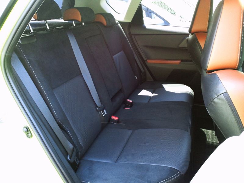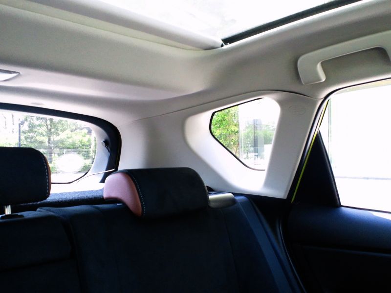 ハンドルは手動のチルト&テレスコピック調整。左右独立のエアコン調整はコンパクトにまとめられたボタン操作。このグレードには前席シートヒーター付き。シフトレバーはブーツ付きだが一般的なゲート式。駐車ブレーキはコンソールから生える一般的なレバー式。メーターの数字が放射状に配置され並んでいたのがこれも普通の配置に直って良かった。運転席にはラチェット式ヒップポイント調整(背もたれ連動)あり。パワーウインドウは全席ワンタッチ。