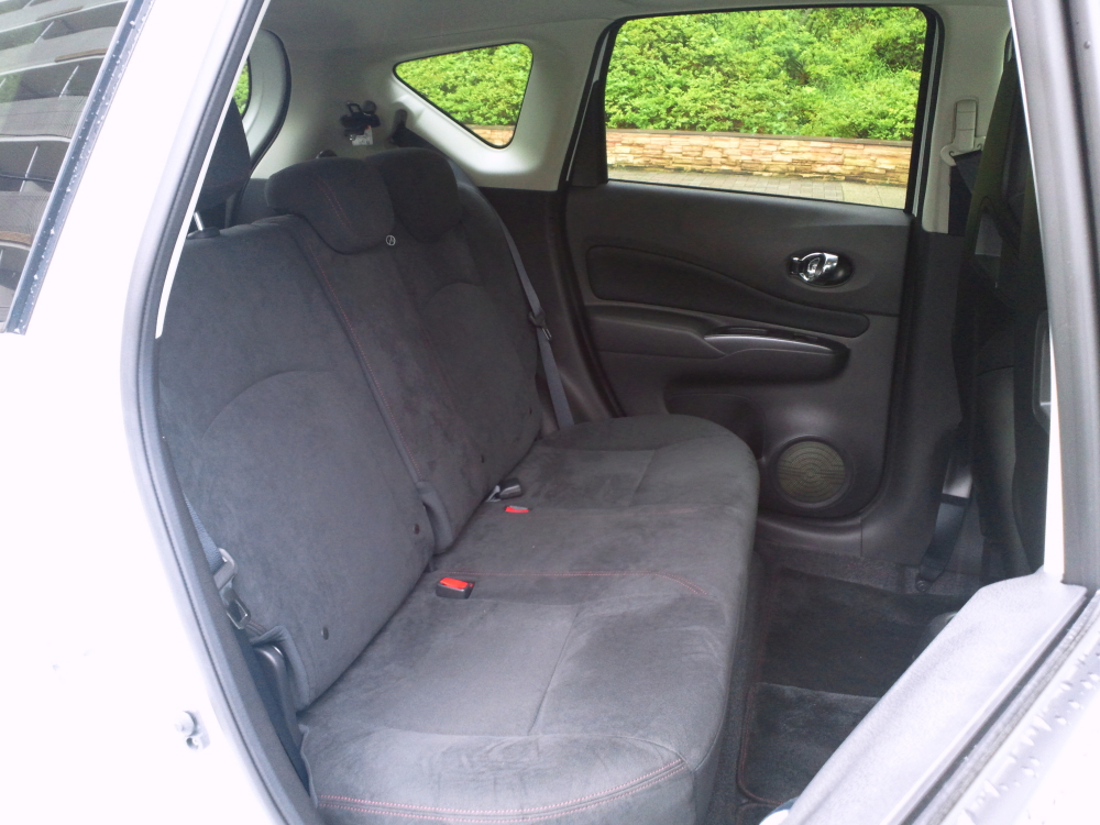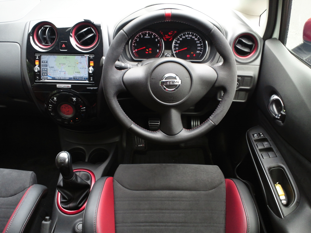 ノーマルのノートとの違いはシートとその素材、またワインレッドの加飾が所々に施されていること。基本的にはハデハデ趣味にあらず、この種のものとしては落ち着いた雰囲気を持っていると思う。それはやはり、そもそもマニュアル車という選択が可能になるのがアラフォー以上の世代が現実的なところであるというのが大きく作用しているのだろう。ギンギンにしたところで若人は振り向かないし、ならば実際に買ってくれようと、興味を持ってくれるミドル層に訴えかけられる仕立ての方が現実的、という判断と想像する。