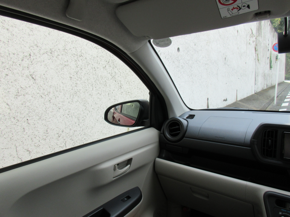 Aピラーは太さ、捻じれ角ともに気にならず視界はすっきりしている。フロントガラスの湾曲も少なく見切りは良い方と思う。残念なドアミラー。トヨタにありがちな撫で肩形状。自車のボディばかり大きく写り、本来「見たい」後続車などを捉える面積が小さい。
