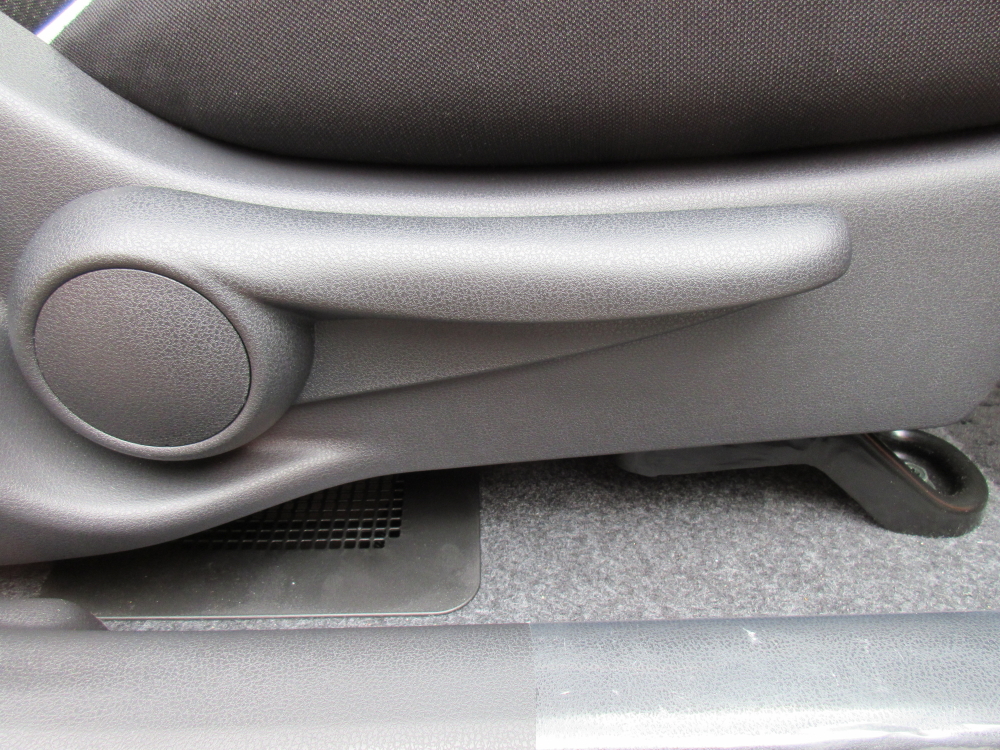 依然としてチョット残念なラチェット式運転席シートリフター。座面の高さしか変わらない。シート全体が持ち上がったり下がったりしてくれた方が、調整により腰の位置がズレたりすることもなく、より親切なはず。チラッと見える空気穴はモーター駆動用バッテリーのためのもの。前席下に設置されている。