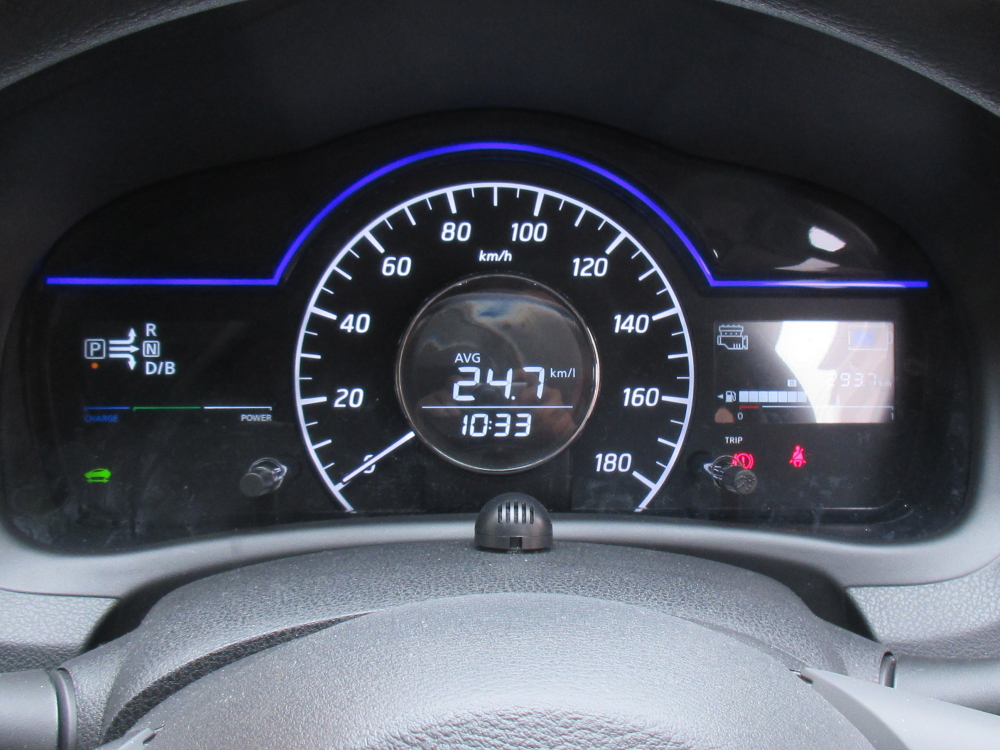 試乗後の平均燃費表示は最終的に23Km/L台だったが、途中27Km/L台に届くこともあった。ドライブモードも選択することができ、おおむねノーマルモードで走行したが、これがSモードやECOモードになると、特にアクセルOFF時の回生ブレーキが強力になり、フットブレーキを踏まなくてもほぼ停止まで過不足なく減速できてしまったりもする。渋滞時には役に立ちそう。