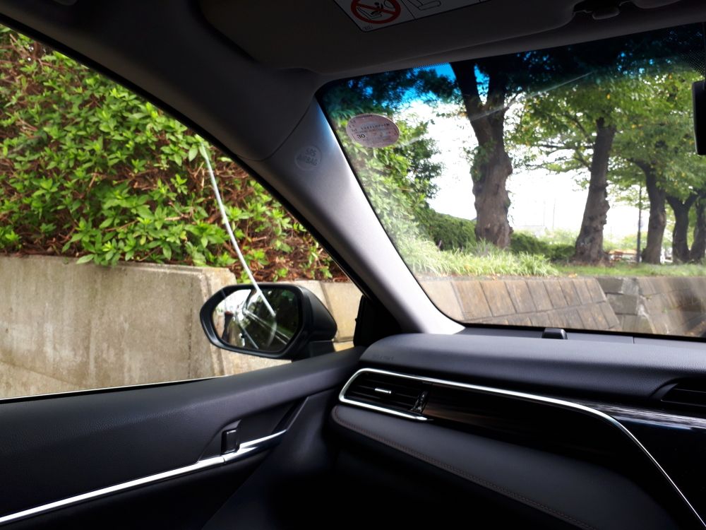 Aピラーは白くてガラスへの映り込みはこんな具合。ドアミラーは撫で肩形状でなく、比較的横方向に余裕のある面積を確保している。このミラーにトランク付近のエッジが見えるため車幅感覚を得る助けになる。ご覧のように内装のクロームの加飾がガラスに映りこんでいる。トヨタ車にはこうした例が多い。