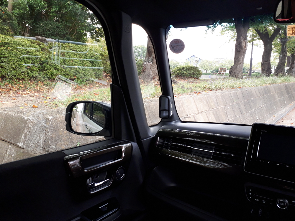 説明通り、たしかに細くなったAピラー。そして依然として視野確保のための効果が大きい、合わせ鏡を応用した「ピタ駐ミラー」も健在。こういうものはどんどん継承、あるいは、水平展開すべきだ。サイドミラーもよく見える。