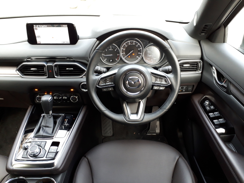 基本的にCX-5と同じ造形と思われるダッシュボード。デザインそのものも無駄な遊びが少なく、かと言って質感も高く機能的。内装色はディープレッドと呼ぶカラーのナッパレザー仕様。濃い茶色に見える。これ以外に例によって白のレザー、他グレードに黒の布もあるが、全体としてカラリングが通り一遍で遊び心がもう一つという気がする。CX-5との差を明確にする意味でも、総額で400万円台という決して大衆的価格とは言えないハイクラスの説得力を持たせる意味でも、これらの色のみならず、何色か選べるようにしておいたほうがいいと思う。なんといっても、カタログを見たときに色の選択肢が豊富に取り揃えてあるというだけで嬉しくなるではないか。車体色も含め、そうした嬉しさも「高級」の要件だったりする。