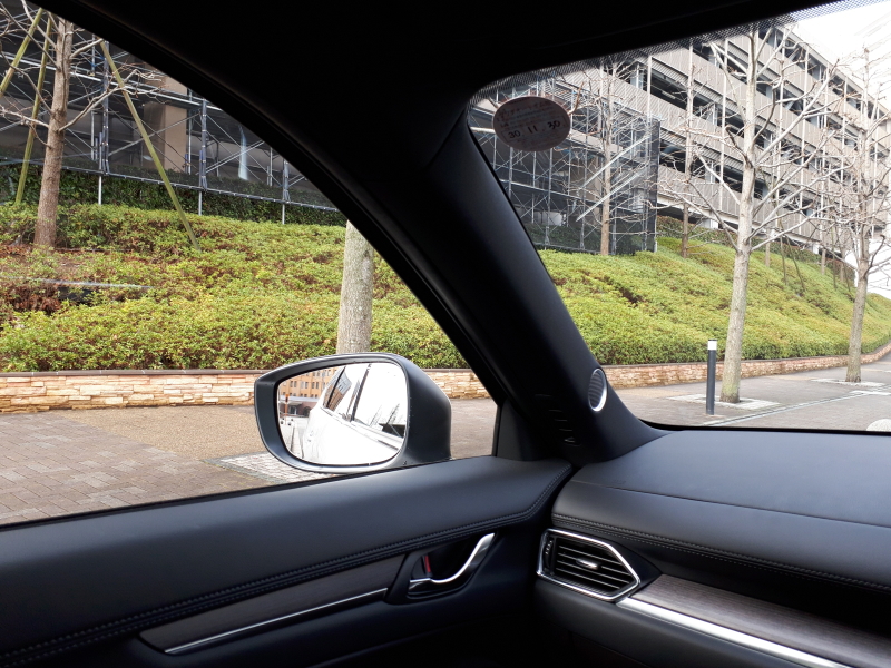 Aピラー内張りは黒い。物理的に太さを感じるが、日光に反射して前ガラスに映り込んでも視界を邪魔しない。ドアミラーは鏡面の面積や形状は良しとして、やや取り付け位置が後方にあるように思う。ミラーチェック時にはやや意識的に首を振ることになる。