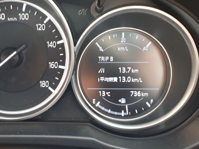 試乗中の燃費は13Km/Lの表示。これはブツ撮り中もエンジンをかけていたためこの値になってしまった。ブツ撮りまでの走行区間では一般道、山坂道を含め16Km/L付近を示すこともあったから、カタログ燃費にはかなり近い数値が出せると思う。