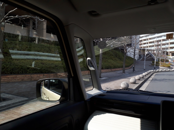 運転席からの斜め後方視界はこのように。運転しながら周囲がよく見えるクルマが欲しい、というオーダーがあったとするならこの種のクルマをオススメすることになりそうだ。ここにも室内設置の補助ミラー。良いアイデアはどんどん真似する。
