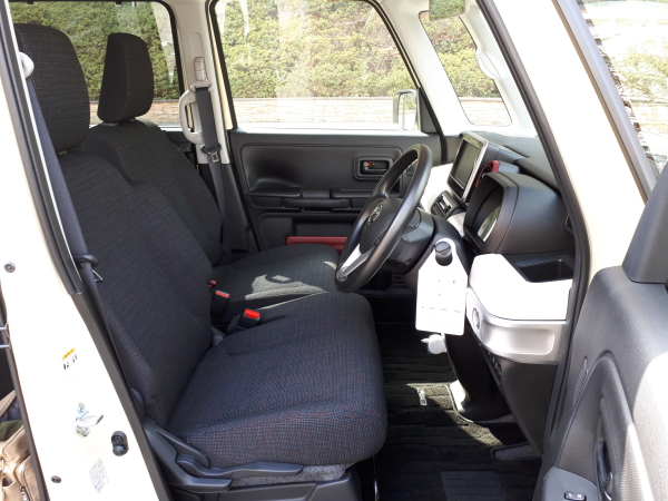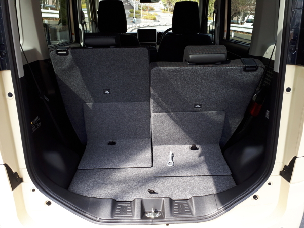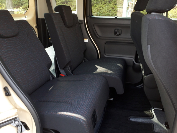 真っ黒のシート生地に見えるが、何色かのカラーミックスになっていてあまり退屈でない。生地そのものも、いわゆるモケット、起毛ではなく、織物を用いていて、滑りにくさやフィット感など、なかなか按配がよろしい。シートそのものも、前回のスペーシアと同様、サイズも大きめでかけ心地も豊かな印象。この前席なら長距離にもイイかもしれない。