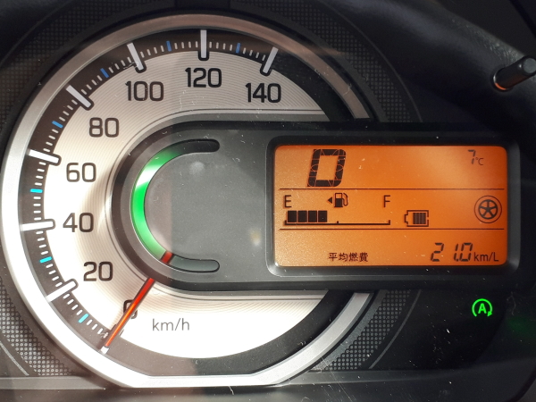 出発前にリセットしたドラコン表示平均燃費は21.0Km/L。市街地と山岳路が8割、高速が2割程度。なにも考えずに走ってこの値が出る。